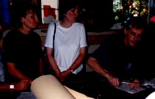 Here, the group is leaning how Monsieur Picol, a talented stained glass artist with a workshop almost in the shadow of the great cathedral, plies his trade. M Picol (right). Mme Nankivell (centre) |